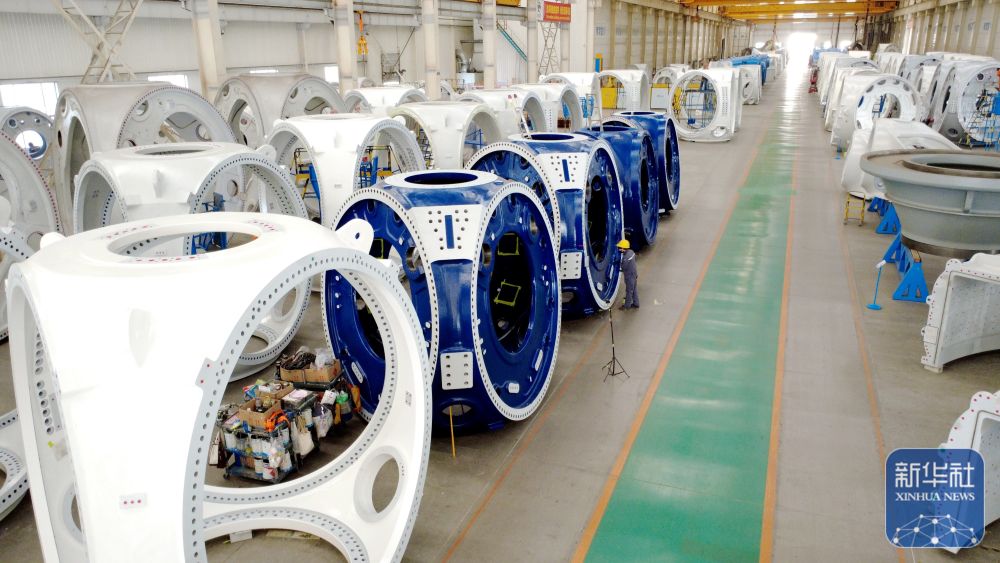 12月15日,工人在山东省滨州市惠民经济开发区风电装备产业园的车间清理风电轮毂(无人机照片)。新华社发(王军摄)