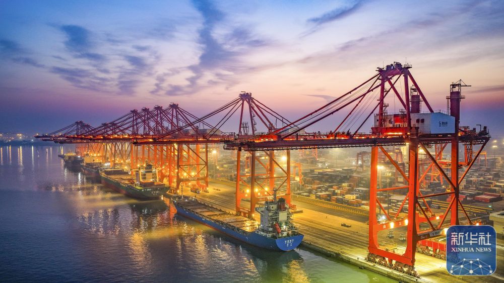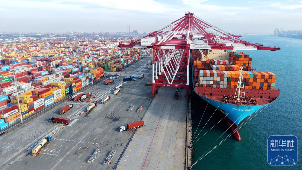 12月15日,在山东港口青岛港,货轮在装卸外贸集装箱(无人机照片)。新华社发(俞方平摄)