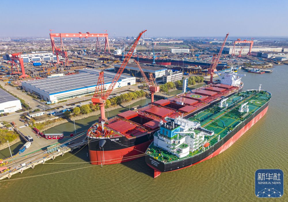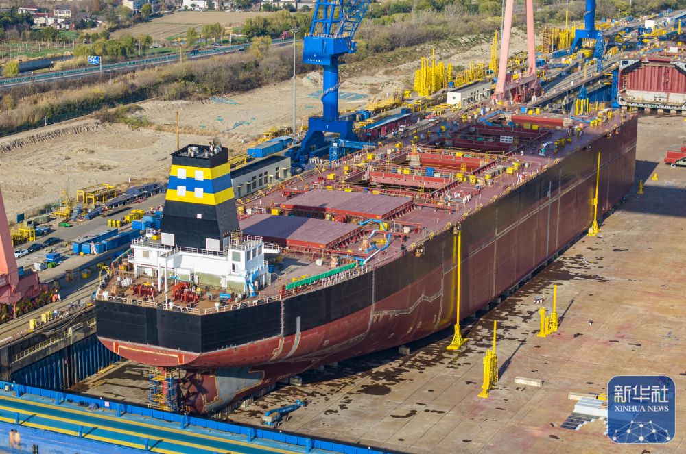 12月15日,在江苏南京招商工业南京金陵船厂生产厂区,大型船舶在建造中(无人机照片)。新华社发(辛一摄)