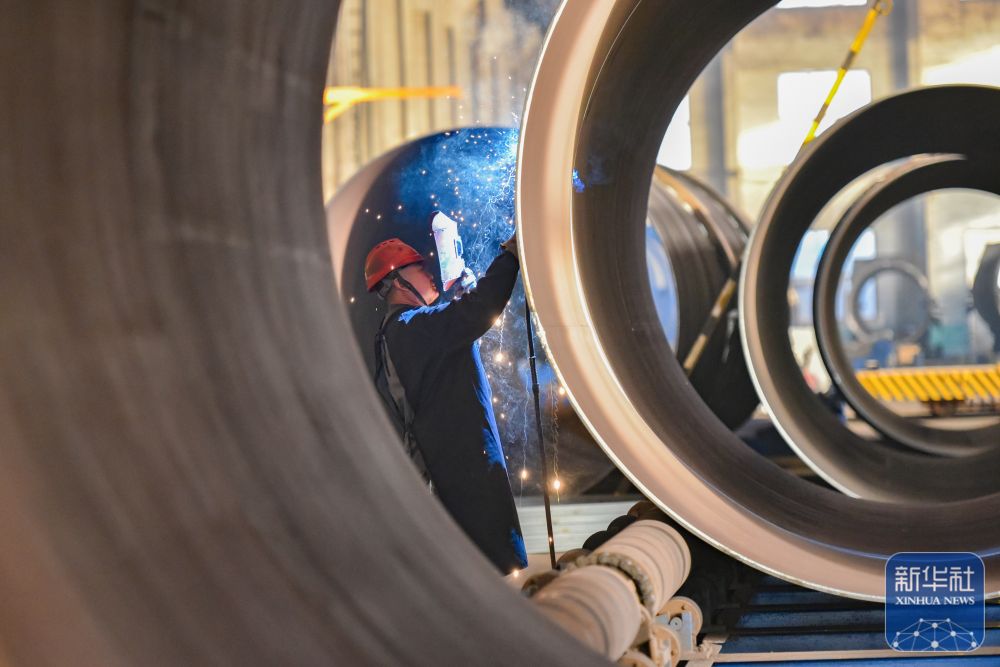 12月15日,在山东省青州市益都街道一家大型风电设备制造企业,工人在车间内进行焊接作业。新华社发(王继林摄)
