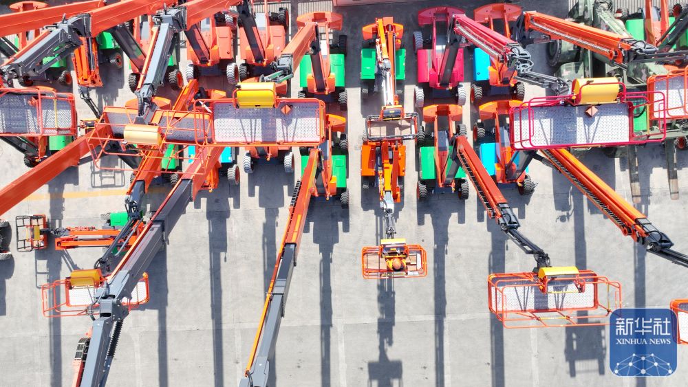 12月15日,在位于浙江省湖州市德清县雷甸镇的浙江鼎力机械股份有限公司,工人对准备出口的新臂式智能高空作业平台设备进行检测(无人机照片)。新华社发(谢尚国摄)