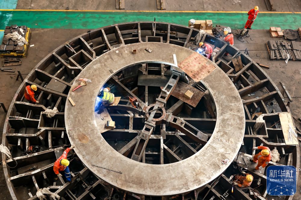 12月15日,中铁科工集团武汉江夏制造基地技术工人对盾构机配件进行装配作业。新华社发(赵军摄)