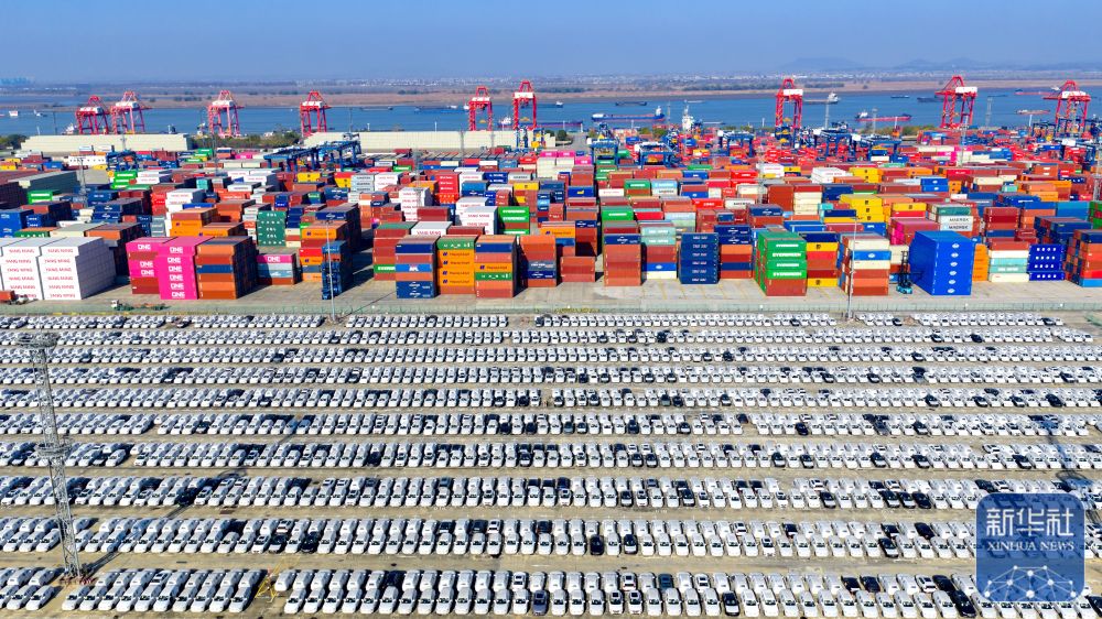12月14日在江苏省港口集团南京港龙潭集装箱码头拍摄的等待装船出口的国产汽车(无人机照片)。新华社发(杨素平摄)