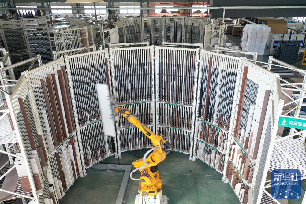 12月15日,在位于浙江省湖州市德清县乾元镇的德华兔宝宝装饰新材股份有限公司家居产业园,智能分拣机械臂在分拣家具板材(无人机照片)。新华社发(倪立芳摄)