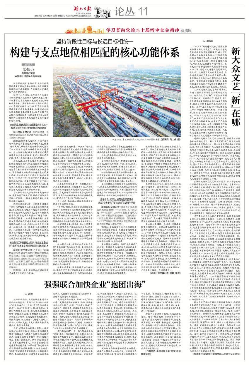 范恒山:全面落实习近平总书记赋予湖北的重大使命任务,关键在于把战略要求转化为系统部署、把战略定位转化为实施能力、把发展目标转化为现实成效,确保总书记赋予的重大使命任务在“十五五”时期取得实质性、标志性进展。
